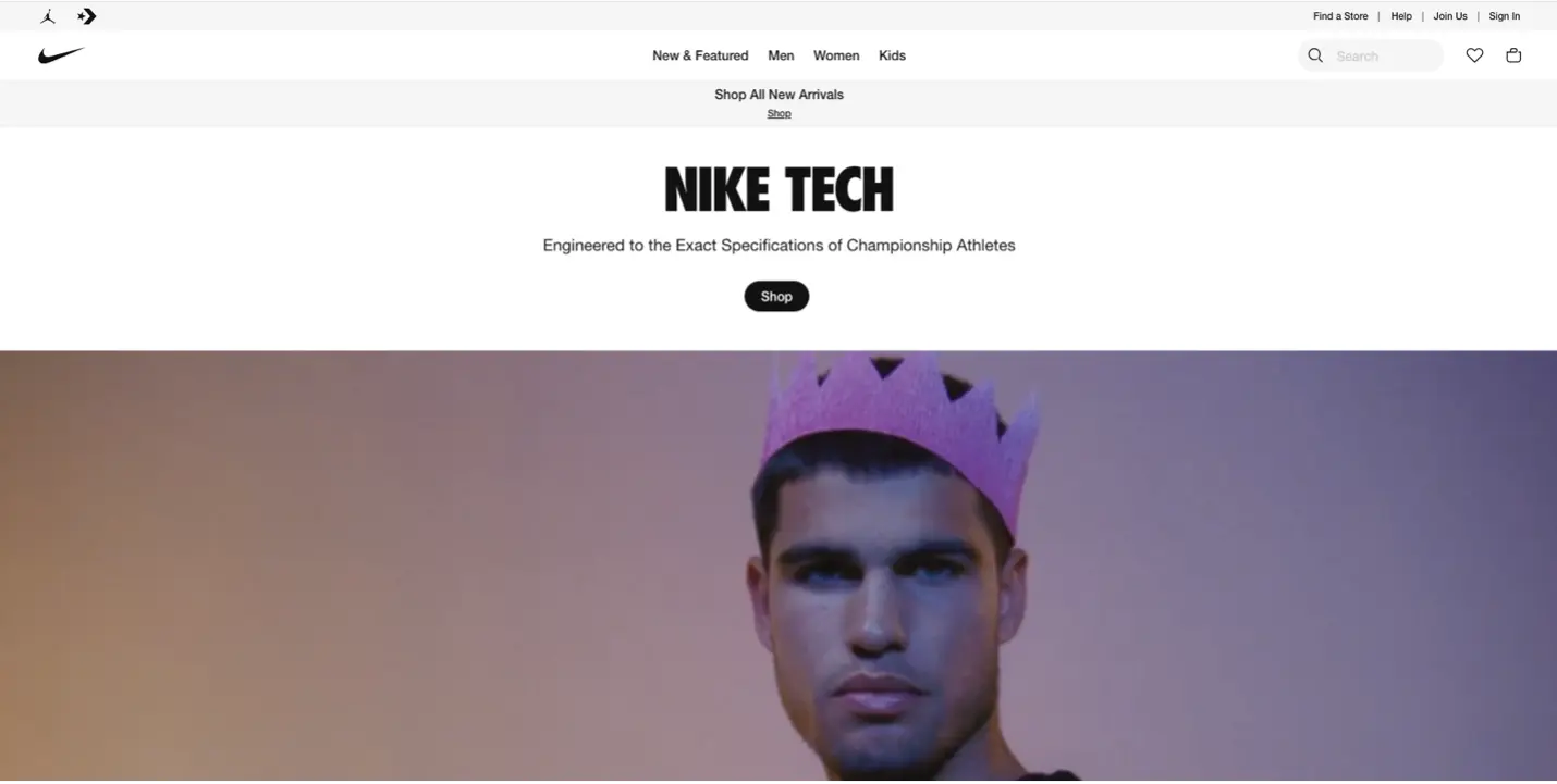 Currently Nike is using their wealth of championship athletes to create inspiration on their website. If you look at the example below, they have a very simplistic navigation menu, followed by a clear product callout and a video. You would think that the video would distract the user from the other elements of the site, but when the screen first loads, your eyes are drawn to the "Nick Tech" large text. When you read on, it discusses "Championship athletes" all while a video of superstar athletes play right below. This is not only inspiring, but it creates intrigue into what exactly is "Nike Tech". This motivates users to click "Shop" to see what this new release looks like.