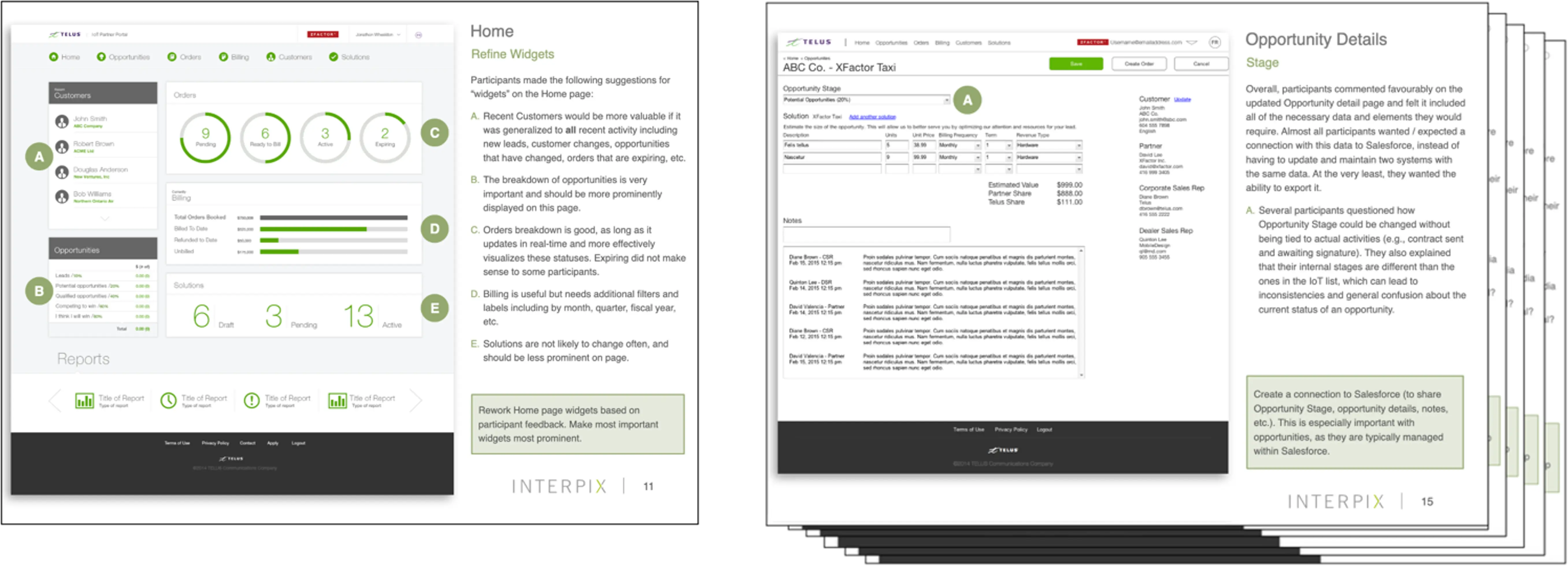 Following the internal review, Interpix looked to actual users of the website to get their detailed feedback and suggestions. The interviews were consisted of 60-minute one-on-one sessions with 6 different users of the website to better understand their pain points. The goal was to gain feedback on the re-designed pages that Interpix developed to identify any additional solutions to further improve their experience moving forward. From this, there were 17 additional recommendations provided and implemented for development. One such recommendation was a description of the specific elements that they wanted to see when they first logged in to the website. They asked for widgets like recent activity, opportunity breakdowns, order breakdowns, and billing information to be included, which we were then able to add into our solutions to the team.